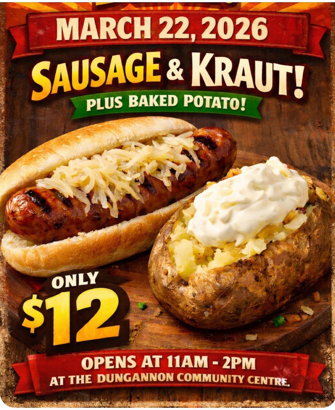 Enjoy a Sausage & Kraut Lunch plus a baked potato for only $12!